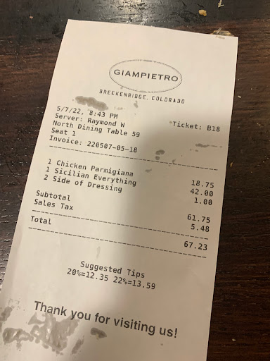 We arrived in Breck super hungry and wanting to find a yummy place for lunch quickly. As we walked down Main Street we kept smelling an amazing smell and literally walked up & down both sides of the street, randomly stopping to sniff the air, until we found it. We must have been a sight to behold - crazy tourists wandering around sniffing the air. So much for blending in with the locals! We finally found the source of the amazing smell tucked away around the corner from the bustle of Main Street - Giampietros. Of course the big question was would it measure up to the standards of two East Coast girls used to amazing NYC pizza. Oh my gosh - it measured up and went beyond our expectations. We ordered by the slice, starting with one (huge!) slice each. Mine with meatballs and my friends with mushrooms. They were amazingly generous with the toppings - mine literally covered with crumbled meatballs and my friends covered in yummy, buttery sauteed mushrooms. My friend also had a side of steamed broccoli (shes the healthy one trying to get in her veggies!) and she said even it was amazing. Perfectly cooked with just a touch of spice & butter. We ended up splitting another slice of mushroom as we couldnt get enough of the pizza, yet didnt want them to roll us out of there. Their food is simply prepared and simply delicious. When we got home I looked it up online and found that they have been named "Best Pizza in Summit County" for the past 8 years. I suspect they will be able to add year 9, 10 and beyond to that title. If youre in Breck be sure to stop by for a slice or two - your mouth will thank you!