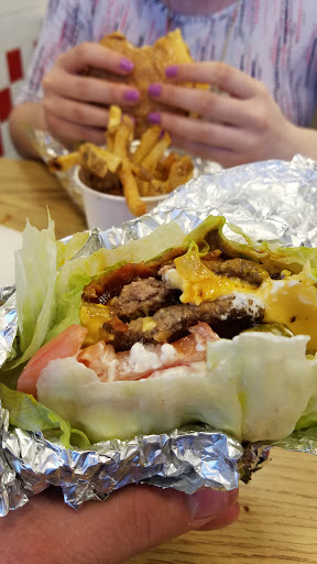Hard to beat a 5 guys burgers. Normal burger is 2 patties. Small is 1 patty. Normal fry is an XL. Great burgers. Get some fro-yo afterwards next door.