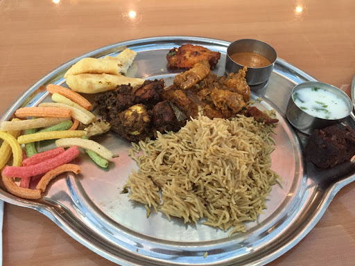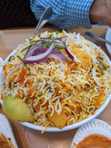 Place has excellent food! Nice, clean restaurant. Were seated immediately and given water bottles. Kids ordered Gulab Jaman right away that came three to a bowl. Were delicious and served warm, a little too sugary for me but my kids inhaled them and ordered another bowl after dinner. Ordered mild goat curry with naan, it came with a side of rice. This was delicious. Pieces of nuts in the curry made it so yummy! Mild is pretty spicy by the way and we eat spicy food! Got the fried chicken biryani, Bezawada biryani. Nice presentation and full of chicken under rice and over top, boiled egg and onions on top. Served with raita and curry to put over biryani. The rice/chicken were great but the curry was super spicy. I LOVED it but was too hot for the kids. Naan was fresh and warm. Only issue is the chicken was cut up so small with bone, that I hardly got any meat, was all bone and kept getting tiny pieces of bone in my mouth. Was worried Id choke on one. Should cut it better. Was scared to feed it to my child. But Definitely will return and try other biryani dishes. Only weird thing was some of the waiters were sitting at the tables next to the TV watching cricket and Indian movie songs, when we came out of restrooms, one was sleeping with his head on the table. If you want to get out of being a typical desi restaurant, these are things that should not be happening in front of customers. It looks bad