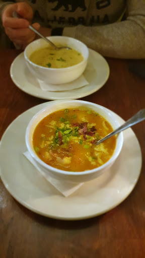 This trip was the second time Ive been to Alchemy. I remembered from the first time they have an eclectic menu + well-crafted cocktails; that hasnt changed. Located in Old Colorado City, Colorado Springs, Colorado this establishment contradicts a lot of the negative preconceptions of Colorado Springs. This is more like a place you would find in Boulder. After the Colorado Springs pridefest, we decided to beat the heat and have a nice lunch in their shaded back yard patio. The patio had more of a hippie ambiance, than a pub, but was still fun. Its a little strange that customers have to walk through the kitchen and pass an office to get to the back patio. It seems like this is something new that they are still working through. Drinks: I had the Clover Club, made with egg whites and raspberries. Jeff had The Alchemist, which was a more sophisticated whiskey based drink. Travis had absinthe. He ordered it "cold" which I thought was odd, but he explained that they also serve warm absinthe here. Food: trying to be a little more healthy, I chose the emerald pea soup. The soup came with a beautiful presentation, including edible flowers, creme fraiche, and was poured out of a little tea pot. The brightness of the fresh peas was great for a summer afternoon. For my entree, I actually selected something from the appetizer menu - the honey lavender smoked salmon and pesto with pita wedges. The flavors were not as extreme as the title implies, none the less it was very tasty. Bob also had a couple of appetizers which were the hummus made of a fresh pea puree, and a Caprese salad. Jeff tried the Irish onion soup. This is a basic French onion soup, but with rye bread. Travis got the garden wrap. The atmosphere was pretty laid-back. I could see at night time this place might be a little more hoppin. Its always a fun time in Old Colorado City.