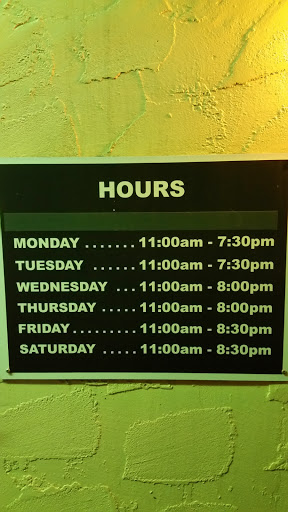 | Working: | 11AM–3PM 11AM–8:30PM 11AM–8:30PM 11AM–8:30PM 11AM–8:30PM 11AM–8:30PM Closed |