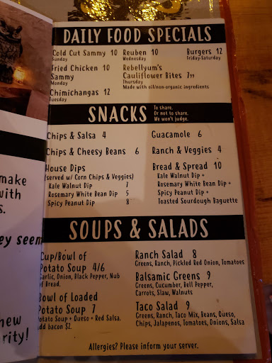 Favorite place in the Springs. Very real. No bull here (literally and figuratively). Vegan bar food is solid, but a step behind Denver competition in terms of number of food items /ingredients. On the bright side, this business model allows for reduced prices. Update: Ambiance here is always good. Its usually busy, but service is pretty solid, especially at the bar. The newest team member, Susan, might be the single most pleasant person Ive ever encountered. The owners are definitely activists in many areas, though the staff is probably a bit more neutral on average. Its a good place to adopt a dog, for one thing. Speaking of which, the bar is pretty dog-friendly, which is just awesome. Drinks here consist of a huge selection of canned beers and alcoholic shrub cocktails. Its very affordable while keeping a bit of craft.
