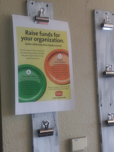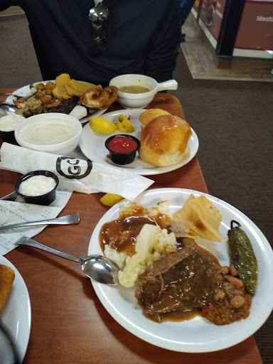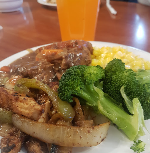 A cut above the average buffet. Where most buffets concentrate on inexpensive items (lots of chicken variations, instant potatoes, plenty of veggies, etc.) to maximize profits, Golden Corral goes for a high volume of customers drawn to a huge variety of selections with upscale goodies in the mix. The salad bar offers shrimp along with lots of fresh veggies. Cooked to order steak is available along with seasonal specials like BBQ brisket & ribs, seafood specials, make-it-your-way pasta, and more. Their slow-cooked pot roast is excellent; tender, juicy, and full of flavor. Mashed potatoes are always from "real" potatoes. Weekend offers breakfast buffet until 11am with a cooked-to-order omelet bar. The wait staff can be overwhelmed at times, and slow to refresh drinks or bus tables. It can get quite busy and crowded during peak hours.