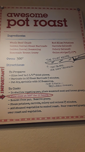 I really like eating here because theres a few good items that I can eat even though the food is pretty bad. Most items are VERY poorly cooked. Soggy pasta noodles, overly dry meat, soups that settle, taco meat and other dishes with pools of water and grease that you have to drain out of the serving spoon, etc. Some Golden Corral restaraunts are so good. This isnt one. I eat at this one often for the few good items like the pot roast, steak and yeast rolls. The other food disgusts me though. It has so much potential of they would just take some care to cook the food the right way.