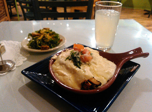 The food is really good, and they have many great vegan options. The menu changes regularly, but the quality and presentation of the food is extremely good. The staff is very friendly and helpful. I love the pay what you can/want option because those who can pay more will, and it helps those who cant afford much. They also have an option to volunteer at the place in exchange for food. Theres a cute little community bookshelf outside on the patio, and the atmosphere is wonderful.
