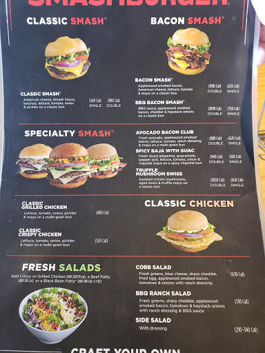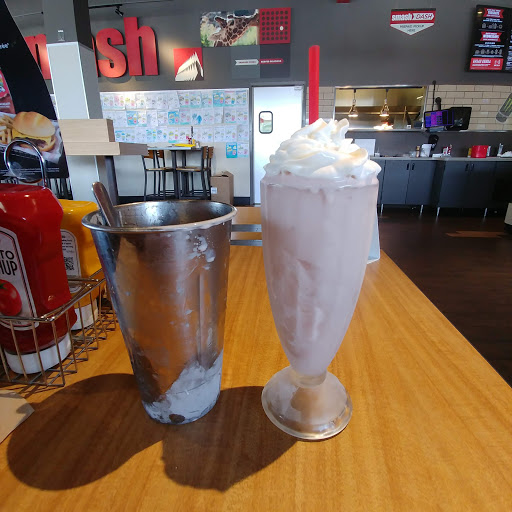 I like this Smashburger! Its new and spacious inside. Arrived late on a Monday night (8:30) and the place was empty, which is why the service must have been super fast :-). Two parties arrived after we did and they received similarly fast service too. We ate a lot of smash burger and fries and two in our party had the harvest salad...one with chicken and the other with a smash burger topping. Delish! We couldnt pass up the shakes to end our meal, two oreo, one butterfinger, and my fave the salted caramel! I love when restaurants give you the extra in the medal container! And, I like how you can order beer with your burger too! Overall, great experience!