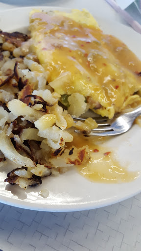 This place has gone downhill so much. The dishes and silverware are dirty. The dining area is crowded, cluttered, and filthy. The service feels rushed, rude, and disingenuous. The food used to be the saving grace here and has finally passed the point of edible. Scrambled eggs came in a congealed mass like a giant fried egg. Hash browns were mushy country potatoes, sloppy, lumpy and greasy. The bacon and sausage in the burrito were not cut up in any way, just a whole piece of bacon and a whole sausage link. Dont worry, the houseflies are free. Sorry to say that we wont be back.