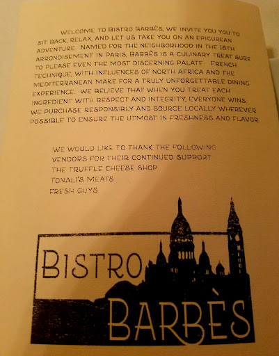 A limited but ultimately sufficient menu in terms of options. The food and service were exceptional. As so many restaurants in Denver have gone more and more casual, Bistro Barbes stands out for still using white tablecloths. The space is small and minimally decorated. And that is perfectly fine because they actually have sound baffling! This means the ambience is less intrusive, conversation is easy even for hushed romantic conversation or older people. So few places in Denver (looking at you especially every industrial modern decorated brewery) do anything about sound at all even though it is such a simple, easy, cheap fix. Addressing the sound does 100x more for me as a customer than fancy paintings or lighting or whatever.