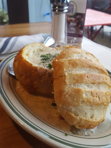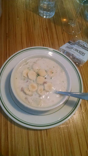 New England Clam Chowder. Not. Canned clams? Rubbery clams . Chowder had no clam broth flavor just potato,flour and milk.Served lukewarm didnt finish bowl. Daughter had mussels with wrong broth so they took off the tomato broth and added butter wine broth...bits of tomato sauce in it gritty and cold. Small portion of calamari also lukewarm . Cant figure out why all our food was cold . Could see the kitchen and plates put up , they didnt sit there long. Our waiter was in a bad mood from hello!? Never had someone so disgruntled...noticed table next to us had a good waiter so luck of the draw? Thought it was expensive for portion size and quality.
