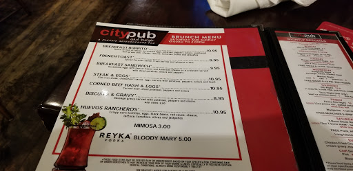 I have been going to City Pub for a couple of years now, food is good, patrons are friendly. We recently had a really negative experience. If Jessica is your waitress or bartender, keep a very close eye on your CC, she is very neglectful of returning your credit card to you in person. She left our CC unattended on the waitress station for over 15 minutes. We advised her otherwise and when we returned a week later she treated us like complete crap and told us to never return. No problem, you just lost about $400 of business a month little chicken neck. Actually, it does not reveal that if you check all the many, many times we frequented City pub. To be frank with you, I am a bartender myself, and I would never run off patrons that pay, tip well and cause no trouble. She is not a business building bartender.
