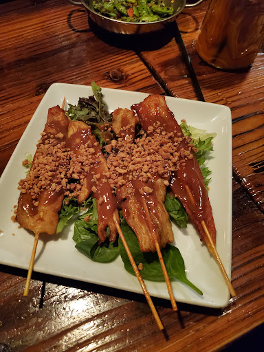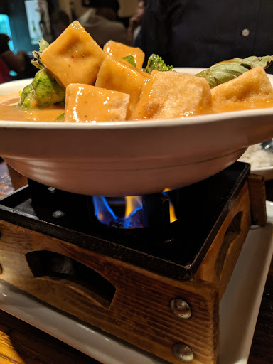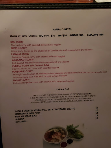 Im a Karma Asian addict. I get their take out a few times a month and dine in regularly for happy hour too. Take out always arrives warm and well prepared. I have some food allergies and they are so cool about it and make sure the things Im allergic are taken out. The green curry is balanced between spicy, earthy with a hint of sweet. Definitely enough for two meals, as are most of Karmas dishes. The veggies are never over cooked. Cubes of tofu are lightly breaded and perfectly browned. Im not a big fan of tofu in general. But their sesame tofu rocks it and is only $6 during happy hour. You have to dine in for happy hour. I usually go with friends but it isnt uncommon to see a lady or gent flying solo. The spicy edame beans are a nice blend of blistered char taste, silky beans and hotness. I have had pad Thai from literally dozens of different restaurants coast to coast and their pad Thai is good. Its not my very favorite dish but its definitely very tasty and prepared similar to what you get at other Asian restaurants. Karma Asian is always good karma!