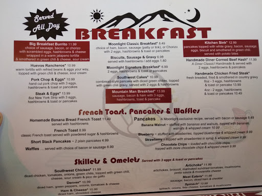 Good choice for a meal near the airport We had to stay the night at the Denver airport hotel and was looking for something simple to eat. We decided to avoid the chains and go to Moonlight Diner. The menu is somewhat limited and not nearly as extensive as a "Greek Diner". The food was pretty good and the service was also very good. I had the pork chops that was large in quantity and delicious in taste. The service was attentive and efficient. My wife had Chefs Salad and that was OK. The soup was very good. The dinner hits the spot.