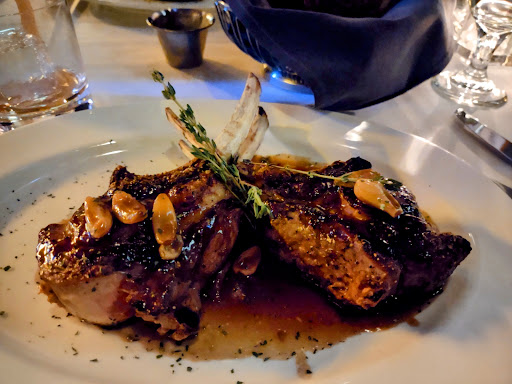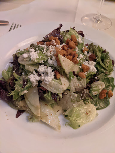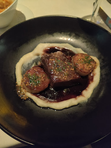 I enjoyed my meal here. The service is friendly and professional and the dining room is well designed. I dined alone on a reservation and was originally seated in the front lounge. I felt a little pressure from the door person to sit here instead of the dining room, and I didnt care for the lounge at all. It was pretty douchebaggy, and I dont care for TVs and live acoustic guitar during dinner, so I asked to be moved to the main dining room. The staff were very kind and accommodating about this request, which I appreciated. I had the lobster bisque, which was OK. For dinner, I had the sea scallops, which was excellent. It was on a bed of risotto and veggies, all of which was just about perfect. The fennel was particularly nice. I had the creme brulee and a machiatto for dessert. The creme brulee was solid, but I did think the portion size was a bit large.