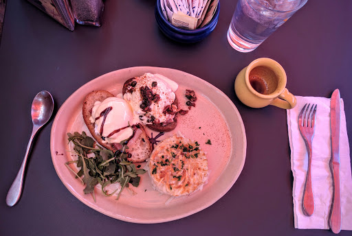 This was an amazing find for brunch before our flight out of town. The restaurant is narrow, but deep with more seating than you would expect. The staff are incredibly happy and friendly and have great suggestions. They also check on you at just the right times; never hovering but youre never left thirsty. Speaking of thirst, their cold brew iced coffee is smooth and delicious. I like my coffee like I like my black holes: cold, black, and sucking all the light out of the room. This is my favorite iced coffee Ive gotten at any restaurant or coffee shop. For food, we got the seasonal pancake, and egg and English muffin, their vegetarian soyrizo, and their breakfast burrito. To add some spice to life, I added goat cheese and bacon to my burrito, as well as a local Denver hot sauce called Red Pepper Chipotle pepper sauce from SaSo Pepper Co. Great combination, and that burrito was absolutely to die for. Add in the iced coffee, a blood orange mimosa, and an iced almond milk latte with no whip and you have the brunch of my dreams. 10/10 would brunch again.