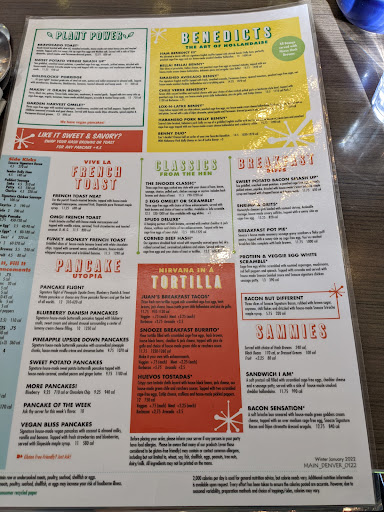 Ive never had a complaint about Snooze ever...except this location. I dont know if its because this is the newest location, but I work across the street on 17th and my food has consistently been bad here in the 5+ times Ive eaten here. The first time I ordered the Corned Beef Hash to go and when I went to eat it, the onions and peppers definitely out numbered the corned beef shreds. Ive had this dish dozens of times before at other locations and know when its different, and this one just wasnt good. The second time I ordered the Bella Bella Benny. Not only were the eggs and hollandaise cold (a big no no for eggs benedict) but the proscuitto was tough and inedible, whereas proscuitto is supposed to be raw and almost gummy. Having not learned my lesson, I tried again with the Pineapple Upside Down pancakes, which have always been wonderful every time Ive eaten them, but not this time. The pancakes had a meat taste to them like someone had cooked them on a grill in the same spot that they had just cooked meat. I looked at the underside of the pancake and sure enough, they were burned with brown charring on them. So, so gross. How do you mess up pancakes?! However, in my desperation for breakfast food in the area, once again I ordered from this location and once again was disappointed. I ordered the Benny Goodman, my absolute favorite dish on the menu, and somehow even that was messed up. Way too much cream cheese, cold eggs, the poached egg yolk was solid, absolutely no runny yolk to be found, and my side order of sausage was burned, cold, and tough. Since it had been a few months since that last visit, I tried it again today and ordered to go and once again ordered the Benny Goodman and once again got cold food that I had to microwave. I showed up ten minutes before they said to show up (told me 20 minutes and I showed up after 10), and my food was sitting on the counter waiting, when I showed up early to specifically avoid cold food. The salmon was super fishy and Ive never had a problem with this benedict tasting overly fishy before. Needless to say, Ive definitely given up on this location and wont be returning. If youre in this area and want good breakfast, try the Snooze on Larimer in Lo-Do or Mangiamo Pronto on 17th street. I usually love Snooze and if you want a go-to location, I highly recommend the one on Colorado and 7th, its their 2nd location and theyve retained most of their cooks since they opened. As for the Union Station location, Im steering clear.