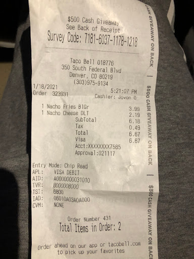 Best Taco Bell in the area I rather drive from Sheridan to this one on federal because the food is always fresh and hot definitely recommend this one on Alameda and Federal because the rest of them suck. Keep up the good work!