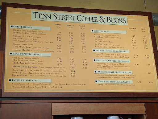 Tenn St. has been my coffee shop of choice for several years. I can write there, enjoy the always-eclectic music, the art displays, have breakfast or lunch, excellent lattes or cappuccinos. Robert is a fine host and the staff are welcoming and efficient, the book selections interesting. I recommend it highly.