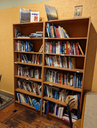 Lovely tree shaded patio with several tables. Most of the books are hardbound, but they are organized. The coffee is Dazbog, and they make a nice mocha.