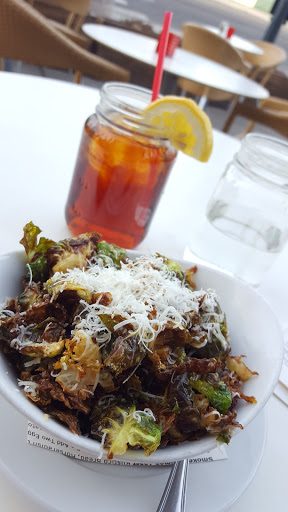 Vegan/vegetarian items sound better on menu than what they actually are. After watching a film at the SIE next door, we decided to catch a late evening dinner at around 9:00 PM Our seating options were outdoors (where you can be bombarded by your choice of vehicle exhaust or cigarette smoke) or indoors where from another section the noise from "open mic" permeates the room, and as an added bonus seated 15 minutes after we came into an empty dining area, next us starts the game of "Cards Against Humanity" where one of the people working here (co-owner?) is playing boisterously with a very foul mouth. They normally have a reserved section in the far corner of the room but tonight they decided to be seated immediately adjacent next to us near the middle of the room. Nothing picques ones appetite for a not inexpensive meal like the table next door describing human excrement as a food item or womens genitalia as if they were co-host with a certain poltical clown prior to aspiring for public office. So the ambiance is deceptively enticing at first and more like a bad pub out of "Bar Rescue" once we placed our order and were trapped. In hindsight we should have cancelled our order and left. It was that bad. The goods... NOT! Vegan Tacos - note its plural. Now most "street tacos" weve had at restaurants in the area have two tortillas to keep their generous fillings from breaking through. Not so here, our server said with a straight face, "those are two tacos". Look at the picture Im including and it is quite clear this is a single taco with two tortilla (which they didnt even grill before plating). Sorry but that is not worth the $6.00 they charge. Much better vegan/vegetarian tacos are nearby elsewhere. "Baby kale salad with apple vinaigrette, spiced cashews and sesame vin 9 VEGAN, GF" - sounds great, especially the "spiced cashews" except they werent. There were a few ordinary toasted cashews and it just wasnt anything worth the overpriced cost. Their "Gardenburger" sounds great with an in house made patty multiple types of mushrooms and garbanzos served on a "Challah bun", what you get for $12.00 is a mushy, rather bland disappointment served on a white bread bun whose dominant taste is the dill pickle slices that need to be removed in order to discern any other flavor. I paid to "upgrade to the Truffle Fries" but they were out so got the "Rosemary Parmesan" fries for $2.00 more instead. They were crispy but way too oily and while they were sprinkled with parm, no rosemary was perceivible. The food here is what can best be described as overpriced "bar food". Its oily, lacks imagination in presentation or taste, and does not make for a satisfying dinner. There are better late evening dining options nearby which are much better. This place has better reviews mostly regarding their brunch. It may be better but at night they are marketing to the "bar scene" not dining.