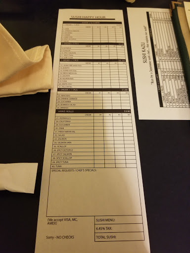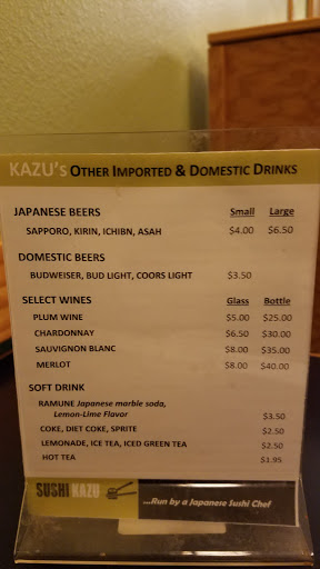 Weve been patronizing Kazu Sans restaurant for the last three days. The only difference is that we a new face for waitresses. Kind and gentle service. Each of the last three days, we tried various rolls and nigiri. Of all my visits, I have been delighted with everything he prepares. I had them make us a new trendy item called the "Mexican Roll" and wow, was that good. I gave him the directions on how to make one and he came through with flying colors. I have eaten at several of the other restaurants in the area and I seem to always come back to Kazu!! I have yet to try his Udon dishes. UPDATE: 12/08/2016 - I am still amazed and astonished at Kazu Sans ability to satisfy my taste buds! This is now going our 8 years for us! :D