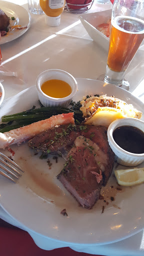Once seated the wait was 16 minutes before anyone even offered water to our party of six. Five minutes is a lifetime in the waiting game and in a restaurant with a bar, cocktails should have been offered within a minute or two at the most to keep the waiting time bearable. Our waitress, once she arrived, was pleasant and apologetic, however, apologies never make up for lost time, the one commodity in life that is nonrenewable. For starters we ordered the Crab & Spinach Bacon Dip with tortillas and crostini’s. Wonderful! The blended taste of light crab on top of the spinach with the bacon at the back was really good. A nice way to start giving hope to the arrival of the entrees. I ordered the 8 oz Prime Rib Au Jus (medium rare) with potatoes au gratin and asparagus spears. In 40 years of traveling I have seen some bad plate presentations and this one was definitely in the top ten worst. The cut itself looked like the cook, no Chef would ever do this, just threw it on top of everything on the plate as if it were an afterthought. It completely covered the asparagus, just one little butt sticking out, like the foot of someone crushed under the ruble of a crashed bus. The potatoes were found oozing out from underneath the weight of the prime rib and barely recognizable at that. The Prime Rib was sinewy with sections that I could not get the steak knife to cut through and the amount of blubbery fat hinted at a cheap cut dressed up in fine clothes. Not top notch at all. I love a good Prime Rib, this one did not want to be loved, and it wasnt. Flavor was adequate and yes, the price should have been a tip off. The asparagus was over cooked and the potatoes a disaster. The other 5 entrees seemed to leave everyone else happy. So five out of six is a pretty good bench mark, but for the one out of six, it was a bad, very bad. I can’t refer anyone here that I like, and won’t be back. Life is too short to wait so long for so little.