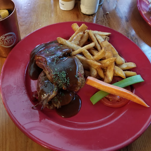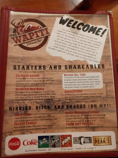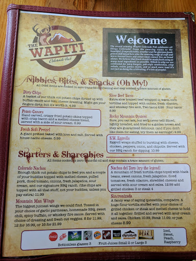 For most of us, the food was either pretty good or really good. However, one of our party ordered a steak ($27) cooked medium. It came out just under well done. When this was mentioned to our waiter, he didn't respond as one would think in a restaurant with a "guarantee" such as the one the Wapiti touts. But, when the waiter shrugged it off, the person just kind of went with it... Also when we received our check, and after some double checking once we were back at our hotel, they did not charge the tip correctly (we'll ignore the fact that they split our party into two groups - they were busy...) but, it was more than it should have been. I checked reviews before we went, and they were overall good. It was really disappointing to be one of the not so good ones. But, I would suggest if you go to stick with the items that the reviewers 'say' are good- burgers, sandwiches, salads... The burrito with hot green chile sauce was good - but if you want a steak or something other than "pub food" don't waste your time here. The person working the bar (manager/owner? Not sure) was kind of rude about the tip thing when the issue was first noticed, and blamed it on the computer. He did give the person in our party a refund of $3.00 for the "tip" and made a very loud point about how it was just taking the money away from the waiter (who did a great job). That point might have been a good time to mention the steak was incredibly overdone, but as he reiterated, it would have taken too long for them to recook a steak so he just left that alone. Overall, it was a disappointing evening. If you go I hope you have a better time than we did. While the food was pretty good