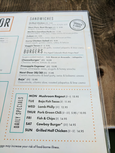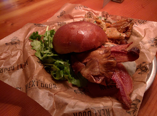 I have been to the Kitchen Next Door 2X. The first time I had the Koberstein burger for $10. Absolutely Loved it! ...but its too small, (it looked like a slider to me); and Nothing but coleslaw comes with it. But they are all too happy to sell you a side.So if you dont mind spending $20 with tip for a burger, Id recommend it. Went there again today for lunch and tried the roasted salad. $10. Just OK. And again, small portion. I even bought a cup of sausage & kale soup for $3.95 with it to help, and Im back at my office right now eating walnuts because Im still hungry. Spent $20 again on lunch, and they didnt even fill me up. Truth be told, I may go back occasionally for the burger, but thats it. And their outside patio needs more seating & mood lights. Cant see the menu after dark.