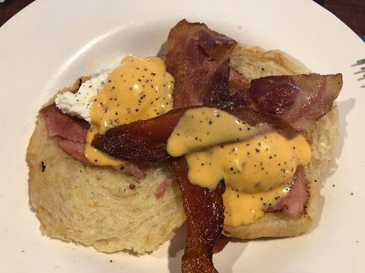 Sunday morning it was busy it took almost an hour to get our food i requested that my bacon be well done crispy and my scrambled eggs be cooked well done . Only because in past experiences at restaurants when they are busy things tend to come out under cooked . The coffee that i didnt order and got charged for was horrible . My husband ordered coffee i said just water and was brought it anyway . my bacon was burnt black in the middle and under cooked at the ends my eggs were slimy. My toast was done but no butter at all very dry My hash browns were so salty i couldnt eat them . My husbands eggs were slimy very under cooked he sent it back and when his food returned there was a burnt piece of sausage half eaten (not his ) on his plate . His toast was burnt . When we complained to the waiter he just said oh sorry . Worst 30 bucks i have spent pn breakfast . Wont be back .....