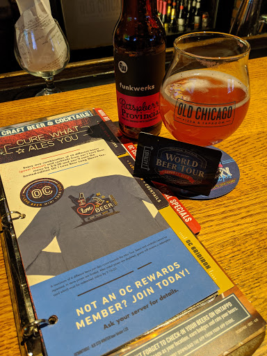 The food here is average and so are the drinks. Service is okay. I dont recommend going on a trivia night because the place is packed, everyone plays on a team (they arent very welcoming to new people) and the service tends to stay in the overfilled bar with those regulars on those nights. I have found nothing to complain or recommend Old Chicago so far. It is an average sports bar and family restaurant.