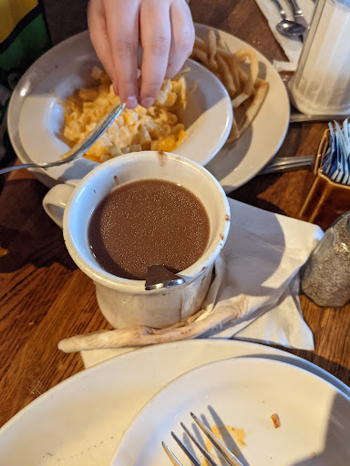 I want to like this place. It has a salad bar, my fiance likes their steak and its one of 3 restaurants in a 20 mile range to my home. But alas, their salad bar always has odd (and inconsistent) offerings - no broccoli, peppers or tomatoes - but it does occasionally have peanuts, mushrooms in marinade sauce and beets. The past two times here, weve had the unfortunate luck to have the same server who could not care less about her job or providing service. For example, she attended to a table next to ours and walked away without checking on us and had to be flagged down for drink refills. She waits about 10 minutes to return if you havent decided what to order and brings food out late (well over half an hour - and this is when it was NOT busy), making the past two visits just a nick shy of two hours each. TWO HOURS. Last time: The food sat way too long before being brought out. The plates were very hot but a grilled cheese was soggy on the bottom and the cheese actually re- coagulated; French fries were cold. Not slightly less heated - cold. The bottom of the burger was completely soaked through (to the point where my fiance ate the burger with a fork). When this was mentioned to the aforementioned server, she gave us the least genuine apology she could, and walked away. At least she took the price of the grilled cheese off. Most recent time: delays were the same. Food temp was better, but the fries tasted like they were cooked in older oil and were not good. The chicken parmesan sandwich was decent and the fiance, while saying the burger was "meh", did eat the whole thing without a fork. The good: Their homemade potato chips are great, and they have a wide range of menu options. The other servers weve had there are pleasant and attentive. Portions are huge and allow for next days lunch and they have tons of parking.