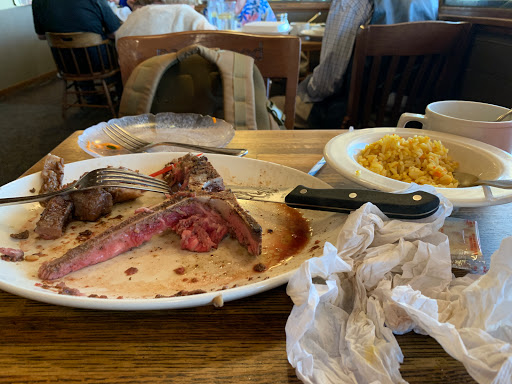 Let me start by saying I have never in my life written a review of a restaurant. I read them often to get a feel for a place, but never write any. I decided to write this one, and in length, because we were SO disappointed in our meal. We thought for sure a place with 14 positive reviews would be good. We were mistaken. We live 45 min. from this restaurant and decided to venture out one Friday night to see what all the buzz was about and use a gift card my husband had won. Reading the reviews first, we went in with high expectations for great home cooked food and wonderful service. I knew to keep my expectations fairly low when it came to the ambiance seeing as this place is kind of in the middle of nowhere and right off the highway. We were greeted very warmly and realized right away this must be a local favorite as there was barely and empty seat in the restaurant. Our waitress was great. You could tell she was very busy, but managed to keep our drinks full and continued to serve us with a smile. The food came out rather quickly, which was good because my husband was starving. We started with the salad bar, which I found lacking. Although the ingredients were fresh, there were a few basic house salad additions I wish would have been there, such as tomatoes and cheese. For the main course, I had the light portion of the fried chicken and baked potato. The chicken was just ok. Ive definitely had better. My husband had the ribeye and a baked potato as well. He was not impressed with the "most popular item on the menu." Although it was cooked just the way he liked it, medium rare, he described the flavor as, "Not good." Haha which I guess explains it all. The potatoes were huge and came with butter and sour cream. We like ours with cheese as well, so we found these to be very bland. We also ordered dinner rolls with our meal. Let me tell you, it is not difficult to please me when it comes to bread of any kind; however, even the bread wasnt good! I will say it was cooked to perfection, but it had absolutely no taste. The only flavor you could get when eating the bread was by slopping a bunch of butter on it. How one can mess up bread is beyond me. We still had money to burn on our gift card, and knowing we wouldnt be back we wanted to use it all. So my husband ordered the peach pie ala mode. He got a huge portion, but only ate about half. I tried some of the ice cream, which was very good, but he said the pie was gross and tasted like it had been frozen for a while then cooked. Our meal was exactly $50.00 including the tip. This seemed very steep for the caliber of food we received. I was happy we had a gift card seeing as it would have killed me to pay that much for subpar food. There were other complaints that I wont mention seeing as its what I expected coming to a home-cookin family style restaurant. I must say this place was busy and there were even people waiting to be seated when we left. So maybe we just ordered the wrong food? Maybe it is more of a local joint seeing as there really are no other restaurants around. Perhaps families like getting out on the weekends to enjoy the only restaurant that is available to them, and dont quite see it really isnt that great? I dont know. My advice? Save yourself some money and make some good home-cookin of your own. Trust me, itll be better than this.