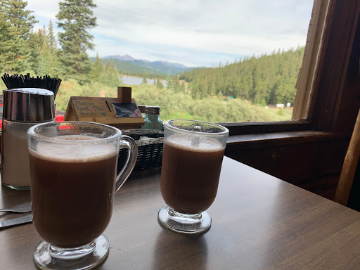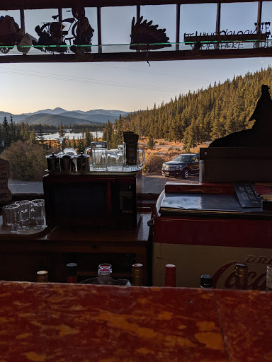 Great food. Buffalo burgers and trout. Bar window overlooks the lake (pic cred Laura M). Tons of hummingbird and a short trail walk around the lake that you can fish at also. Nice car camping site next to lodge where you can pitch your tent and grill out or walk over and have fresh breakfast lunch dinner. All types of Mt Evans merchandise and custom Mt Evans shirts hoodies and jackets. Nice and cool on a hot day. Great motorcycle ride and road bicycle ride but do be careful on the lovely curves for cars.