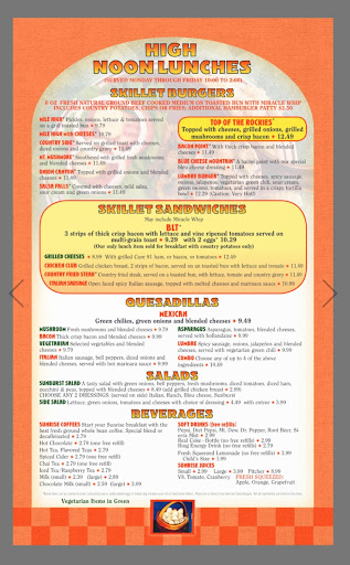 7-6-15, 900 am. Excellent service, server was pleasent attentive and very nice. Ordered the Denver omelette, comes with sausage ham and bell peppers, English muffin and country style potatoes. Only comes with blended cheese, I wanted American. Food was excellent, nice portion size. I drove over 1000 miles last night in one shot to get to Denver, it was nice having a great meal with great servers. I recommend Sunrise Sunset to out of state visitors