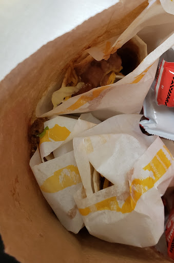 I was been here twice in the last month and both times have been very sick from eating Chicken Tacos. Fun way to spend my work day.......Nauseated, stomach cramps and diarrhea. TMI but unless you want the same Id avoid it. Twice Ive thrown away the 2nd taco after scarfing the first because of some weird taste, like sour cream gone bad. Fries are super bland, cold and not salted. I never ask for ketchup but did today because I recalled from my first order this month how flavorless they were. Oh...the sprite was good.
