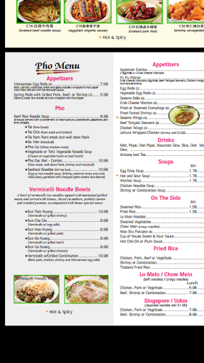Worst order ever! Maybe it was because it was the one time I didnt buy more then $50 worth? Or order was Pho Dac Biet Combo Beef Rice Noodle Soup, Vermicelli with Grilled Combination, Combination Singapore Noodles. The Pho was just chicken and VERY little vegetables on the side of the broth. The Vermicelli meat was BURNT. Grilled and burnt are different things, the meat was coated in a thick layer of solid black, the shrimp literally crunched in half when I tried to see if I could find some edible piece. With the Combination Singapore Noodles, it honestly could have been my fault, we had never tried it so we thought we would give it a shot but we couldnt figure out what it was in the ways of meat. When I think combination its usually some seafood, beef, and chicken or pork... no idea what was in there but I am pretty sure there was only one kind of meat and huge amounts of egg cut to the size of what you would expect to be meat? Honestly, I liked this restaurant, they had amazing Pho last time, but they failed so badly tonight I am pretty sure we will never order again. Maybe they should give every meal equal consideration regardless of the order total?