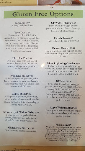 We LOVE Le Peeps Longmont! Gluten free waffle or pancake delicious! Service is quick, friendly staff, cozy old time feeling. We have been regulars for years! Try it!