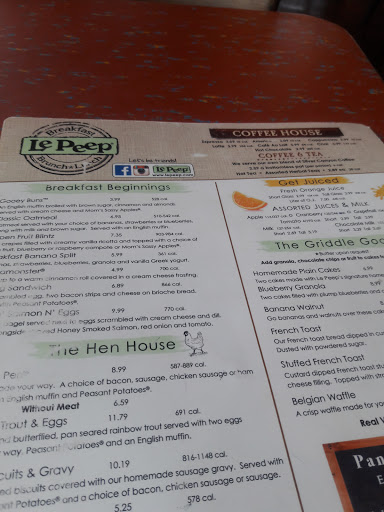 Ive always been one to love breakfast restaurants and when I tried Le Peep a few years ago, it was instant love. The egg dishes are generous and prepared quickly and served with beautiful additions. The smoothies are excellent in quality and taste just like one would expect them too, rather than just tasting like yogurt. My favorite dish is "Eggs In a Nest" which is a classic french toast with eggs IN them. It comes with the peasant potatoes which are amazing, and your choice of breakfast meat. As a vegetarian they are always more than happy to substitute the meat with more potatoes or their warm berry side dish. All in all, a great restaurant. Friendly staff, fast service, and cozy atmosphere!