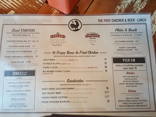 Offers a great variety of fried chicken and other options along with several beer and alcohol options. They do offer a mimosa and bloody Mary bar (we were there on a Sunday but assume its also on Saturdays). Didnt try it but they have a ton of garnishes (including bacon) for your bloody Mary. Had the Brussels sprouts to start. It is a good sized portion that can be shared by 4+ people. Some were charred (just the way I like them) but none were burnt. The white meat fried chicken plate is a breast and wing along with a side and cheddar biscuit. The chicken was fried well with a crispy outer and juicy inside. The biscuit was very good and comes with a side of apple butter. I chose the collard greens for my side, which have some kick to them and also have pork shoulder pieces. Did I mention the fried chicken is gluten-free? Very few places offer that and this is why my wife hopes The Post opens a location in Denver sometime soon. Good service, fun ambiance and a meal worth coming back to Longmont for.