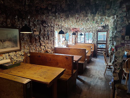 Yeah, no. So, let me break this down into two categories: atmosphere and food. Atmosphere: Its a bar, tucked back in the mountains. Theres decidedly less underwear than there used to be, but theyve been replaced by hundreds (possibly thousands) of signed $1 bills. There are also names and passages written all over the walls, and in the case of the tables and benches, carved into them. I cant imagine its possible to keep carved tables cleaned, and you can tell. The waiter did come over and wipe the table with a vaguely cleaning-smelling cloth, but it didnt do much to solve the stickiness. You can pass the time waiting to be served by reading the salt packet holders crammed with business cards, from all over the world. Food: I ordered a burger (the one with cream cheese and jalapenos). I wasnt asked how I liked it cooked, which Im unable to tell if that was a failure on the waiters part or to protect me from foodborne illness. Also, $1.95 for a single can of Coke? That seems very steep to me. It arrived in a reasonable amount of time, and was unremarkable. The burger was well-done, the juiciness was ok, but the jalapenos couldve been pickled green bell peppers for all the heat they added. The veggies on top seemed fresh, and the bun was fine. Overall, Im conflicted. On the one hand, this is a unique saloon tucked back in a unique area. It was suggested to me that this is the Casa Bonita of the mountains: That you maybe suggest it to out-of-towners, but youd think twice about eating there yourself. If you were passing through and just wanted an Always Clean, Always Meh Coors, that seems like a safe bet at the Bucksnort. If youre hungry? Id consider someplace else.