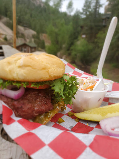 Atmosphere and decor were interesting, and beer served in a glass pitcher was cool, but the food was some of the most disgusting stuff Ive ever eaten, especially for the price. Seemed to be a hoppin tourist getaway hangout, but Im honestly not sure why. If youre in the area, maybe a nice place to stop for a beer and a smoke overlooking the creek on the back patio, but stay away from the food menu. Burger= 13 bux, gross greasy flavorless lumpy patty on a soggy bun, kinda had the taste and texture of playdoh molded by a 5yo Quesadilla= 11bux, not made with cheese or anything that tasted remotely like food Chips, salsa, guac= so obviously just Pace salsa and the cheapest tortilla chips u can but at Safeway. Plastic bag guac. We begrudgingly ate this since we were so starving, but they should really be embarrassed to charge $7 for that crap The menu says "go to McDonalds if youre in a hurry"...while I typically stay away from greasy fast food joints, I can say with confidence that the $1 burgers at mcds would have been a better option. Paid over $50 here for disgusting nonsense "food". It was cute, but definitely disappointing