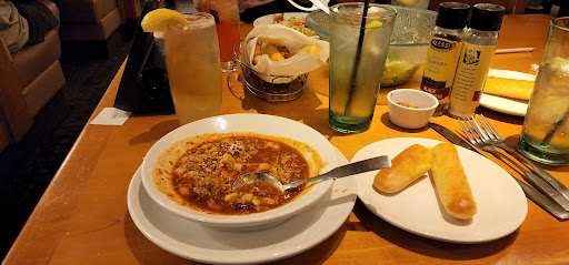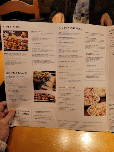 Horrible food - if this were my first time eating at an olive garden Id never go back. Calimari was cooked to crisp, chicken parm was solid as a rock, the food looked and tasted reheated. Had we gone to the grocery store and bought frozen dinners, the quality would have been about the same, but we would saved $100 bucks and the upset tummies.