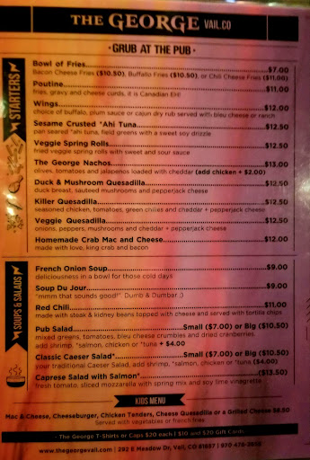 We love the George. Great food and fun crowd. A hidden secret in Vail. The duck is the best as well as crab legs , fish and chips and shepherd pie.