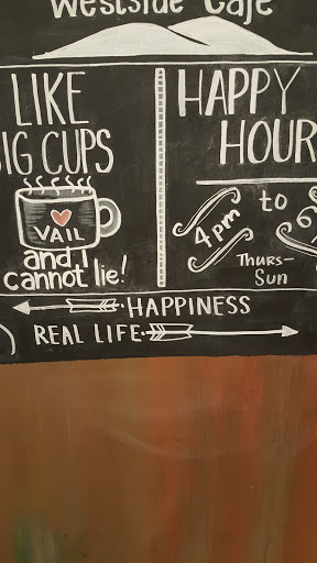 The sign on Westbound Interstate 70 a 1/2 mile before the West Vail Exit is how we found Westside Cafe. It was in the morning (wanting breakfast) and were looking for a CAFE, not a Vail Restaurant....we end up making a great choice. My wife & I both looked at each other with dismay.....after all, we were in Vail.....we thought we were going to pay $15 for a $5 breakfast.....quite the opposite. Everyone we know that is traveling thru Vail gets the strong recommend from us about WestSide Cafe.