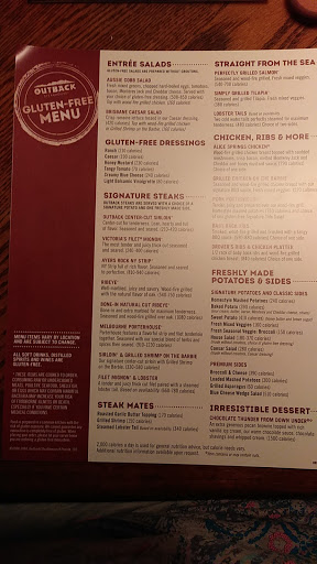The server was really nice but the first one we had who must have gone on break or finished his shift seemed confused and was never very interested in giving us service. They also have a fragmented electronic ordering system they are trying to integrate. You order drinks, appetizers or desert through a tablet at the table, but order your entrees through the waiter/waitress. The speed which the appetizers comes out is great but the system itself is buggy and they should have you do all through one ordering system or another. Its almost like they dont want wait staff to work hard checking on their customers or providing good service. The food was average as you would expect from a chain restaurant but the grass fed burger was pretty good. The blooming onion rings which they are known for dont seem to have the crunch they use to. If your hungry for a decent meal and want to check out a new order delivery system go check out your nearest outback.