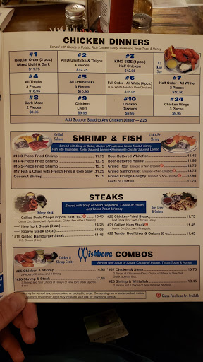 I still LOVE the Wishbone Family Restaurant. The fried chicken is absolutely mouth-watering, finger licking, good! Service is good. The menu has enough variety for everyone, but hey, if you go to Wishbone, you should go for the chicken. Wishbone, Chicken, need I say more!? Love It! Prices - good. A meal of 3 pieces of chicken, a baked potato (or fries or instant mashed), texas toast, and yummy gravy = $9. You really cant beat that! Yummy! Delicious! Hits the spot! Food - good, actually quite good! They also have salads, steaks, and some appetizers, and of course, desserts! Interior - bright, open, nice blues and browns, large interior, can easily accommodate large groups. There were 7 in our group today. Parking - private lot with plenty of parking spaces. See you there!