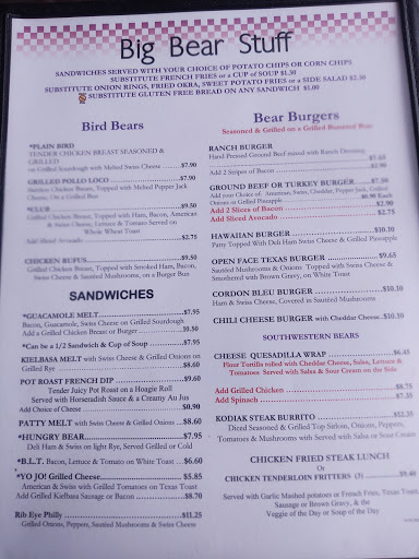 Whether you live here or you are just passing through, this is the place to be. Their breakfast is the best around and their portions are extremely generous. The atmosphere is what you would expect from a small town local favorite with an eclectic assortment of bear decorum. Ive only been during breakfast, but their lunch and dinner options look great. Their crepes are fresh and sweet, if you are looking for something hearty, get the omlettes or their massive breakfast burritos, and the Cindy Lou is a must try. You will not be disappointed if you give this place a try. Just get there early enough so you dont have to wait very long.