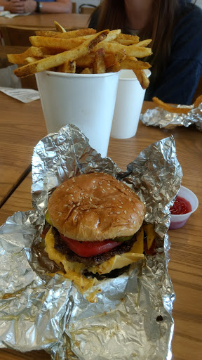 Five guys is for those who want something quick and better than fast food. The burgers are juicy and big and you can customize them when ordering. The menu is basic but they also have a few other items like hotdogs and grilled cheeses. A lot of people like the fries because they are handcut....they are certainly good quality but I dont like the taste all that much. They also hold a lot of oil so if your stomach hurts after something oily, you may want to go easy on the fries. BTW, the regular size is enough to feed two people so dont get a large by yourself!