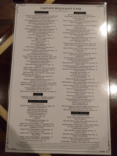 Lakeview Restaurant is on the lake in Coventry Conn. They offer Italian, Seafood, Steak, Pizza, Sandwiches & Burgers. They have an outdoor deck overlooking the lake. They have a large bar, and big screen TV. When we first arrived we were happy to be reunited with our favorite waiter, Joey from Coventry Pizza, who we had not seen in 3 years. We sat in a booth overlooking the lake. I got the Rib Eye Steak Sandwich topped with a delicious combination of sauteed onions, peppers, mushrooms, and cheese. The Steak Fries were the way I like them; hot and crispy golden brown. Liz got the Chicken Broccoli Alfredo served over Linguini. I sampled some, both the chicken and white sauce were very tasty. The portion was very generous, we took half of it home. Joey, our server, was very attentive & friendly. Leo, the manager, thanked us as we were leaving and was very friendly with us. Next time we try an appetizer; Chicken Wings, Fried Calamari, Stuffed Mushrooms, Sweet Potato Fries, Shrimp, Smelts in a Basket. Then split an Antipasto Salad, or Baked Lasagna.
