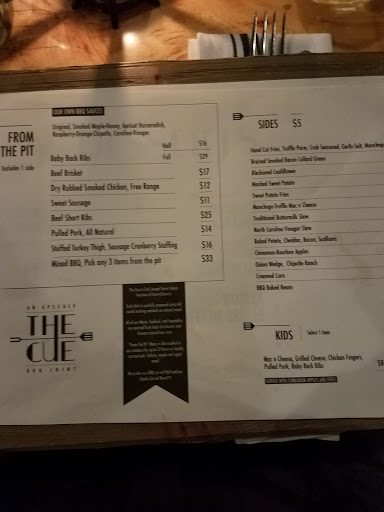 I visited this place during its soft opening. Wow is the only word I had in mind when it comes to the meats, service, and the sides. I was wasnt expecting to have the awesome experience and delight that I did when during a soft opening to a new restaurant and eating the food from this place. The meats are seasoned and smoked perfectly. The brisket was like butter in its softened state; it melts in your mouth. I could taste either truffle oil or salt as part of the seasoning for the macaroni and cheese, exquisite! The corn bread was nice and buttery, full of flavor along with the hush puppies .To top everything off the home made sauces form Chef Joe was so delicious that I could have drank each in an 8 ounce cup and have asked for a second serving. The place was filled with life when we went. My only recommendation is sound attenuation panels to help keep down all the fun people are having. My hat goes off to the founding family member and Chef Joe as well as the staff: very pleasant. I would recommend this place to anyone who loves BBQ and a good time. Simply put, this is not only good eating; its fantastic eating experience. It also has a nice full bar with excellent beer selections too! I definitely give CUE BBQ five stars and then some. Ill be back!