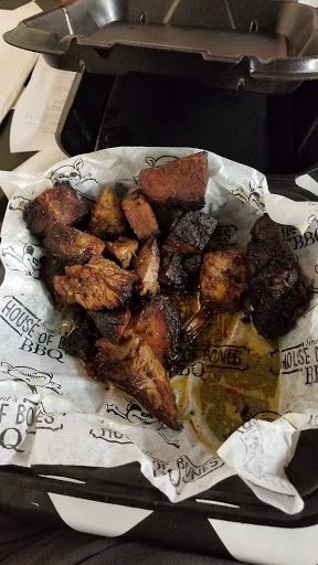My God! If you want the best barbeque in the area you must go here. I had a party today for my wife and had some trays ordered from House of bones. After picking up the food I was driving home and the barbeque smell in my car was overwhelmingly delicious. When I got home and we opened up the trays the steam and aroma filled the room. People at the party said it was the best barbeque they had ever had. I couldnt agree more. It made me crave barbeque. It makes me want to have a party again and have more House of bones barbeque. We had ribs, pulled pork, chicken and cornbread. Also Cole slaw and potato salad. Lastly, Mac and cheese. Every single item was the absolute best you could ever want. The ribs had meat the came off but not too much. The taste had a slight bite to it. Just the right amount. And to boot we were given three sauces: hot, sweet and mustard....all three were to die for.you could spoon it alone and be happy. Thank you House of bones. Never leave. Cant wait to devour your food again.